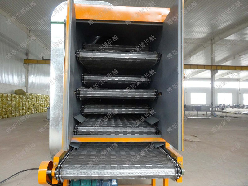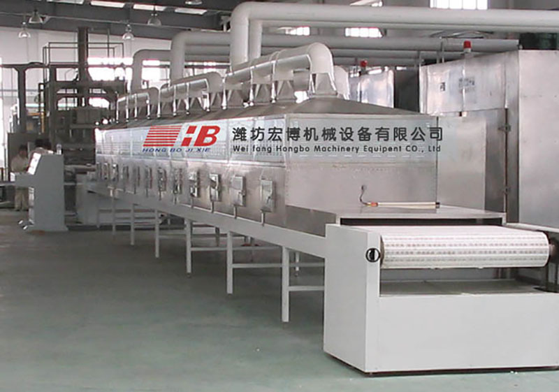 宏博公司生产的网带式烘干机,是穿流连续式干燥设备,用于透气性较好的片状、条状、颗粒状物料的干燥,对于脱水蔬菜、中药饮片等类含水率高、而温度不允许高的物料尤为合适;设备采用高温抗拉钢丝网带,热风加热,均匀受热,具有干燥速度快、蒸发强度高、产品质量好的优点,对脱水滤饼状的膏状物料,需经造粒或制成棒状后亦可干燥。设备配有无极变速机,可根据物料厚度和含水率调整进料进度,从而达到理想的烘干效果。